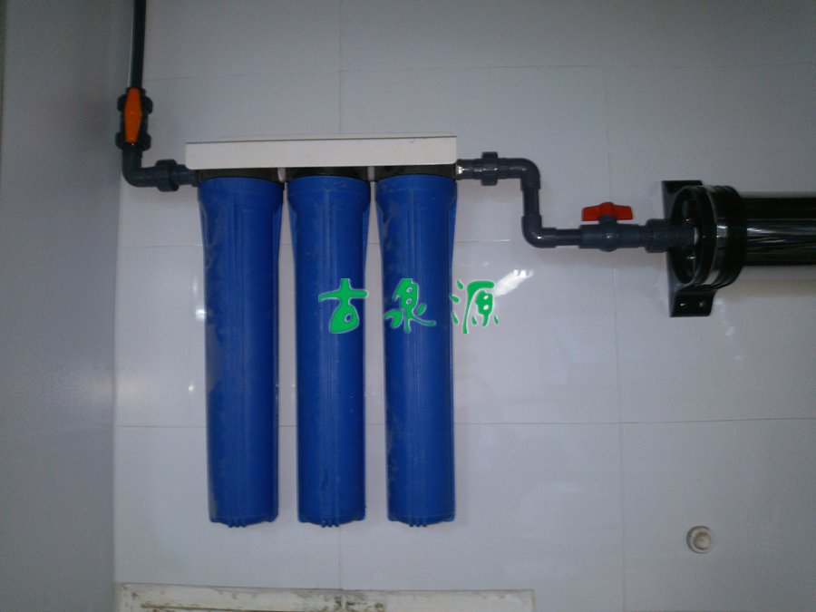 項(xiàng)目因?yàn)槭羌矣茫园惭b快速簡(jiǎn)單,從送貨到驗(yàn)收一共只用去了半天的時(shí)間。前置預(yù)處理我們采用了三個(gè)單級(jí)過(guò)濾器的串聯(lián),分別應(yīng)用了5μmPP棉、顆?;钚蕴?、1μmPP棉,將水中的大于1μm的雜質(zhì)顆粒等除掉,并且可以有效的保護(hù)超濾膜的使用壽命。